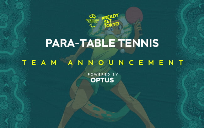 A dark green background with the Australian Paralympic Team mascot, Lizzie the Frilled Neck Lizard, with a red table tennis bat in her right hand playing a shot. At the top of the image in the middle is the Paralympics Australia logo with the words #ReadySetTokyo in gold to its right. Below this is the text: Para-table tennis Team Announcement powered by Optus.